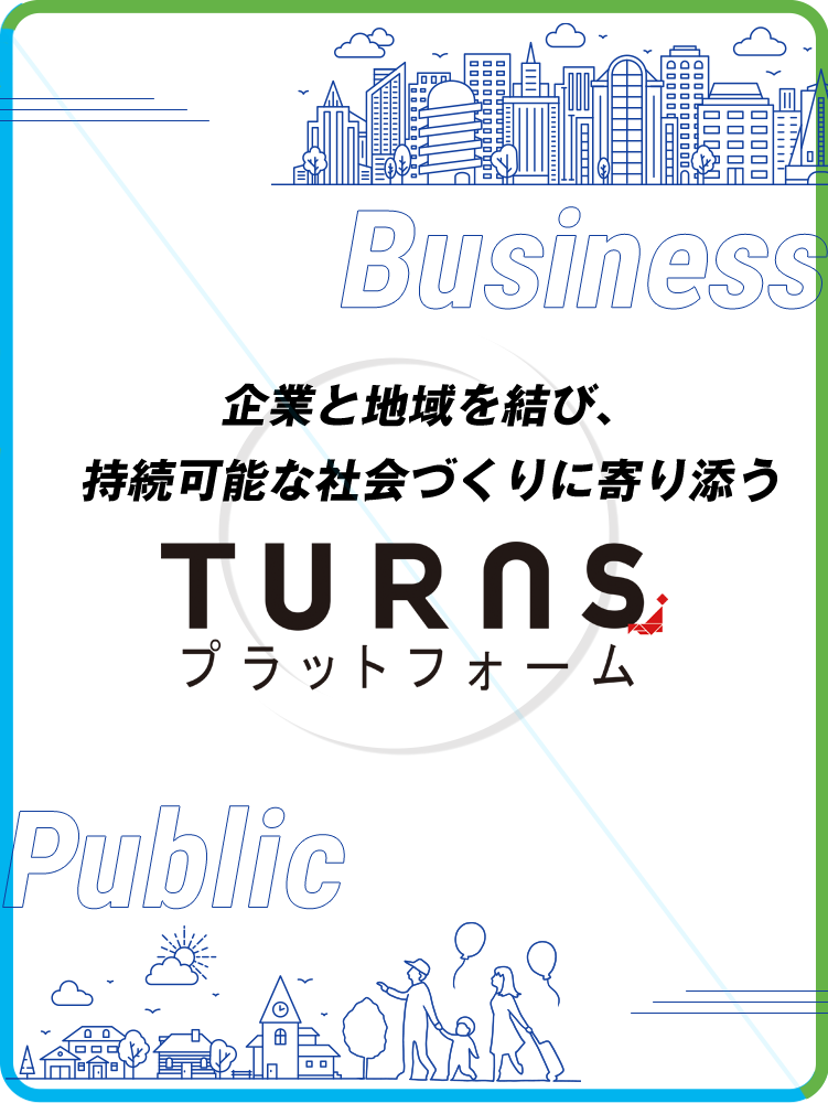 TURNSプラットフォームは、地域課題の解決に向けて行政と企業が双方の役割を明確にして連携することができるサービスです。